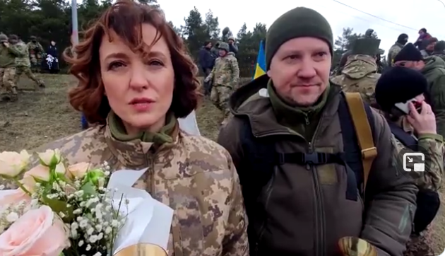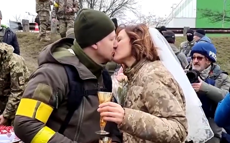 Pareja ucraniana se casa en puesto militar Lesia Ivashchenko y Valerii Filimonov, una pareja ucraniana cambió el salón de fiestas por un puesto de control militar y contrajo matrimonio en #Kiev, en pleno escenario en el que el país intenta resistir a la invasión de Rusia.