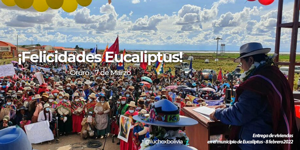 Hacemos llegar a nuestras hermanas y hermanos de Eucaliptus, en #Oruro, un afectuoso saludo en el 42 aniversario de su creación. Apreciamos su productividad, tanto agrícola como ganadera, con la que aporta a la economía del departamento y del país. ¡Jallalla Eucaliptus! https://t.co/chjhRD4k9L