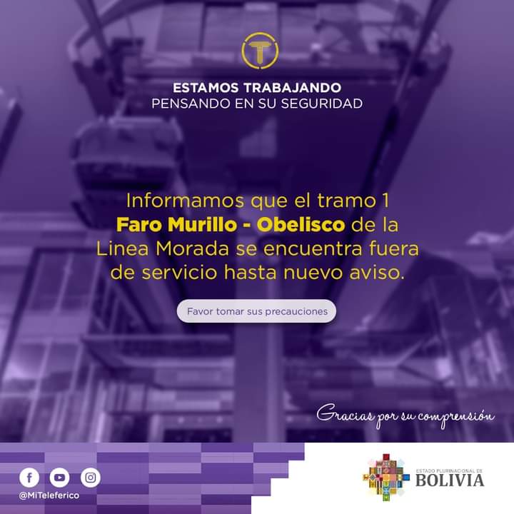 #ANF @miteleferico informa que el tramo Faro Murillo – Obelisco (Prado) de la Línea Morada está temporalmente fuera de servicio. Sin embargo, el tramo 6 de Marzo- Faro Murillo, de la misma línea, opera con normalidad. pic.twitter.com/bI9jNGRY5H