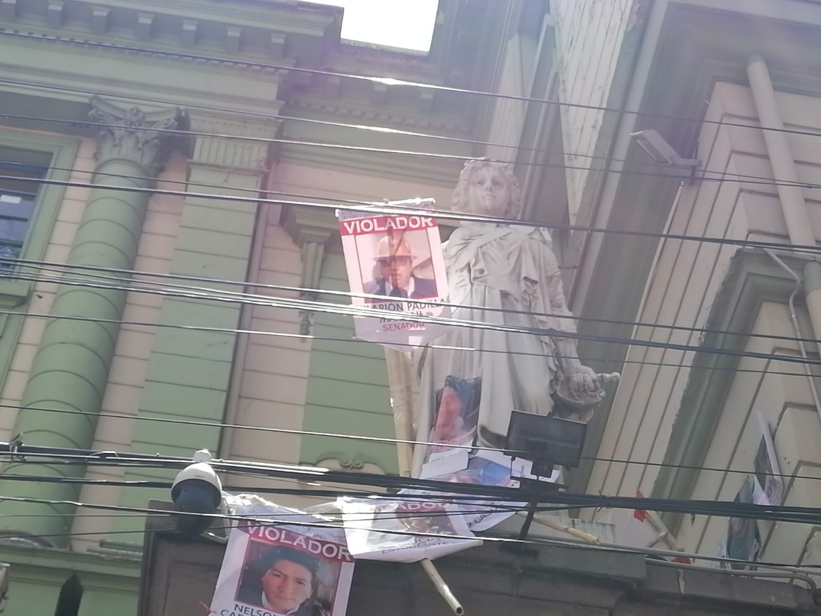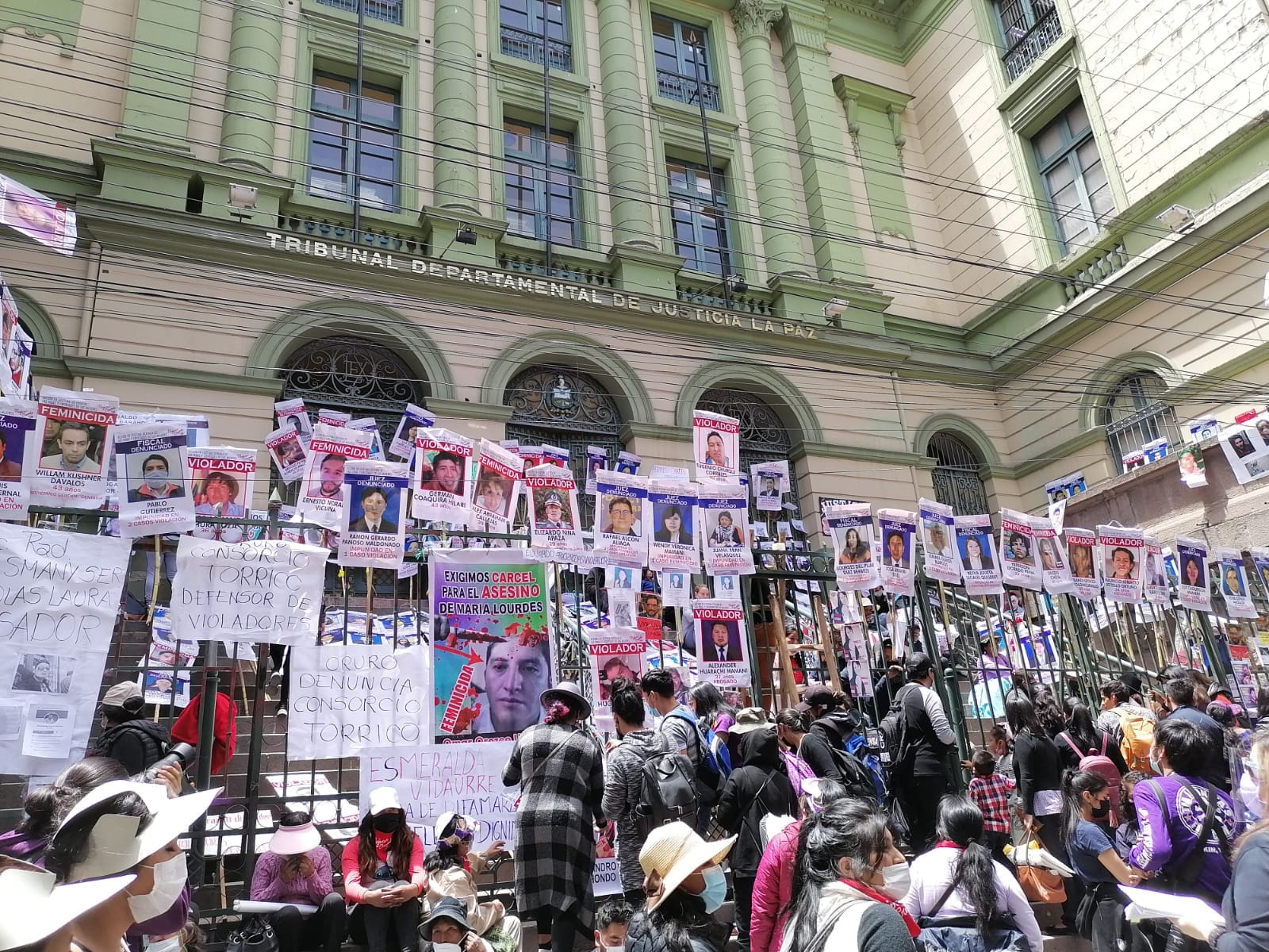 De esta manera la protesta de mujeres que llegó al Tribunal de Justicia de La Paz concluyó colgando fotos de víctimas de la violencia machista, además de jueces y fiscales denunciados.