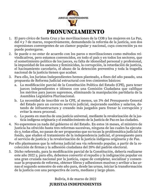 Tras varias movilizaciones y protestas por parte de diferentes sectores los “Juristas Independientes” plantearon la reforma de la justicia a través de un referendo popular para modificar parcialmente la Constitución Política del Estado.
