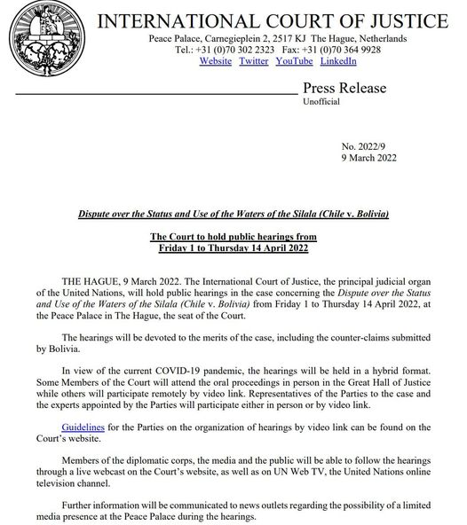 La Corte Internacional de Justicia de La Haya determinó la realización de las audiencias públicas entre el 1 y el 14 de abril en la demanda por las aguas del Silala entre Chile y Bolivia.