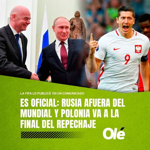 La FIFA anunció que el partido entre Escocia 🏴 y Ucrania 🇺🇦 en repechaje se jugará en junio. Además, Polonia 🇵🇱 recibió el pase automático en esta fase, tras la descalificacion de Rusia 🇷🇺.