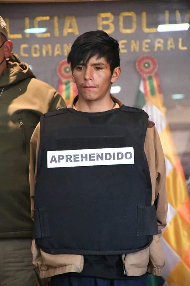 «El primer caso se trata de un caso de homicidio que sucedió en la ciudad de El Alto. En fecha 5 de marzo en la zona Puerto Mejillones se procedió al levantamiento legal del cadáver de un joven de 24 años de edad, quien presentaba heridas punzo cortantes, lo que según las pericias médicas provocaron su fallecimiento. Inmediatamente se tuvo conocimiento del hecho, se iniciaron las investigaciones con la revisión de cámaras de seguridad y también con la colección de indicios materiales, entre otros, dando con los implicados de este lamentable hecho. Por tal motivo se aprehendió al señor José Mamani Mamani de 20 años de edad y a los menores de edad de iniciales M.A.R.M. y A.M.M. de 16 años de edad.