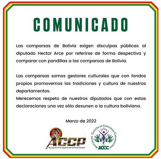 La Asociación de Comparsas del Carnaval Paceño y Cruceño (ACCP y ACCC) emitieron un comunicado público exigiendo disculpas al Diputado Hector Arce (el “Carnicero”) ante los comentarios de compararlos con pandillas y grupos irregulares. Esto se dió el martes cuándo el diputado mencionaba que “no estamos eligiendo (por el defensor del pueblo) al presidente de una pandilla, comparsa o grupo irregular…sino al defensor del pueblo”. (Link del comentario: https://fb.watch/bFCrI30Wxa/ )