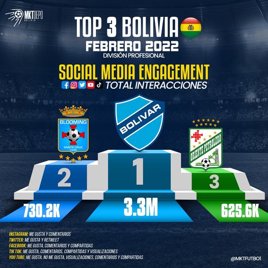 📲🔝Nuestro Top 3 de los clubes de la #DivPro🇧🇴 con mas interacciones en sus redes sociales, en #Febrero2022