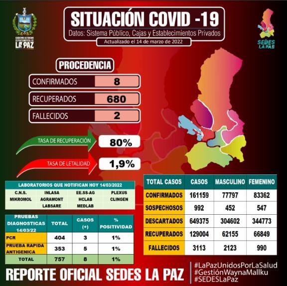 #ANF El Servicio Departamental de Salud de La Paz reporta para este lunes ocho nuevos contagios y dos decesos. El total de nuevos casos corresponden al municipio paceño, tanto #ElAlto como áreas rurales no registraron nuevos casos positivos. https://t.co/wfSrKvv5VX