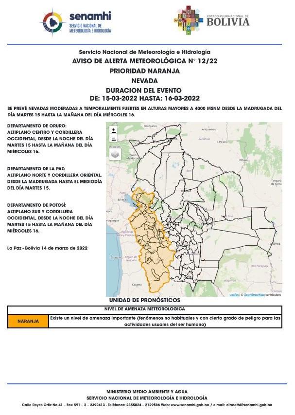 #ANF El Servicio Nacional de Meteorología e Hidrología (Senamhi) emite alerta por nevadas en los departamentos de #Oruro, #LaPaz y #Potosí. El fenómeno climático iniciará desde este martes hasta el miércoles 16 de marzo. pic.twitter.com/CShi7Co1bH