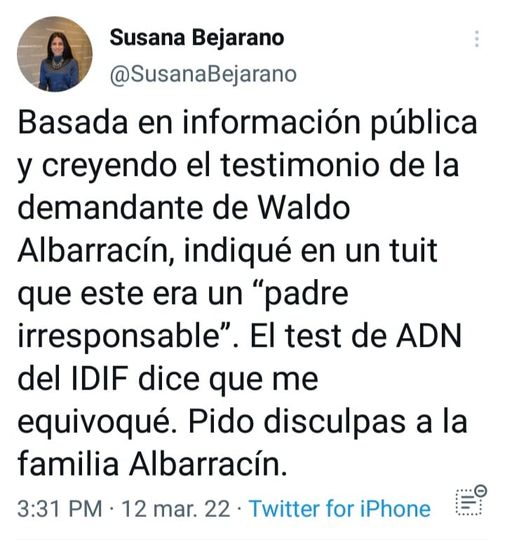 «El test de ADN del IDIF dice que me equivoqué. Pido disculpas a la familia de Albarracín», escribió en sus redes.