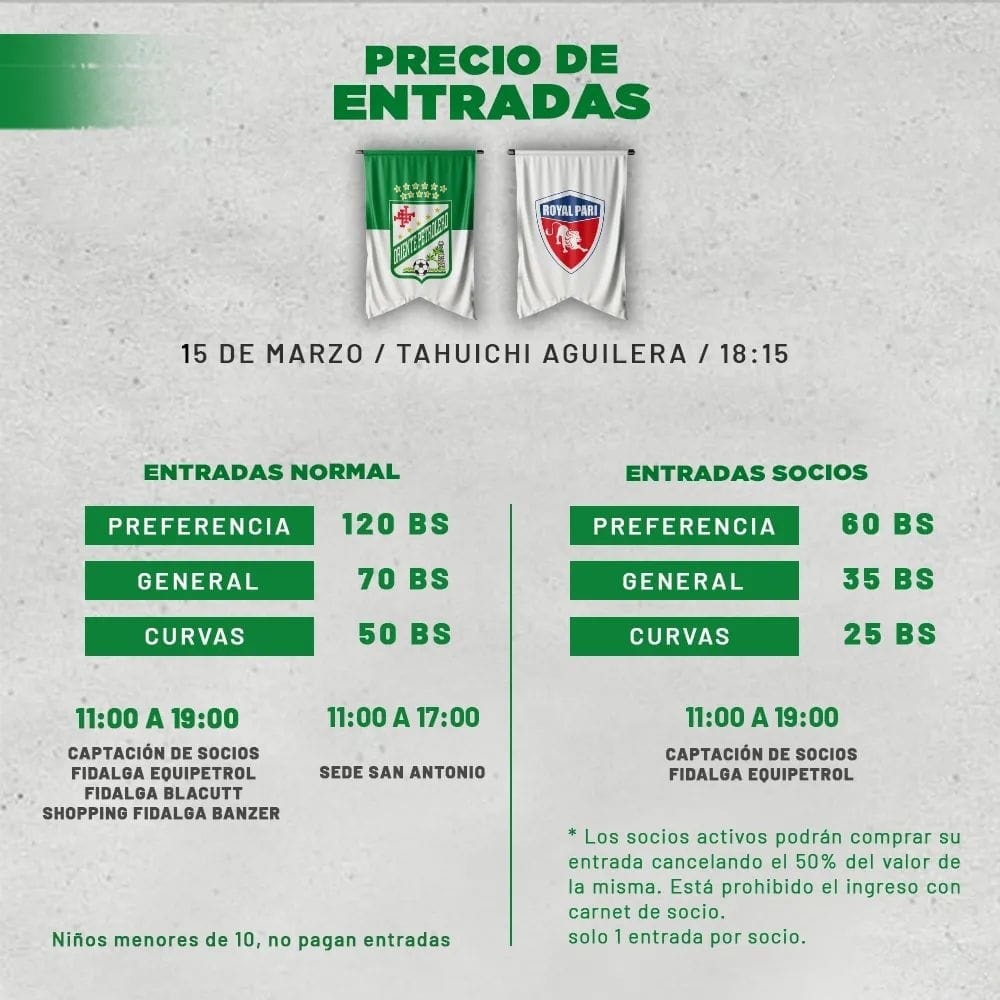 Precios de las entradas para la Copa Sudaméricana. Oriente vs Royal Pari.