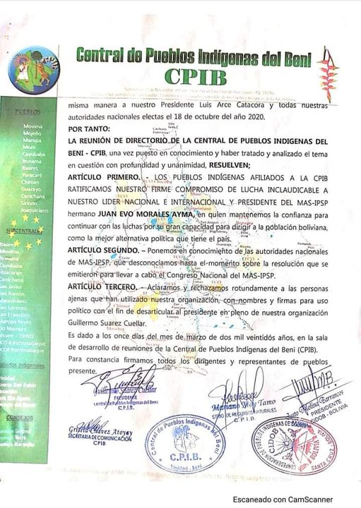 La Central de Pueblos Indígenas del Beni, ( CPIB) ratifican el liderazgo de Evo Morales y desconocen la convocatoria de solicitud de una convocatoria de Congreso Nacional del MAS IPSP.