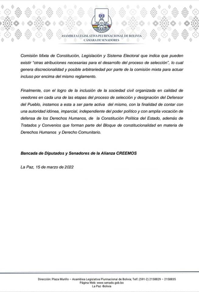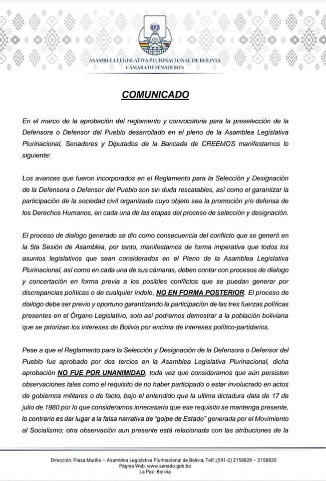 La Bancada de Creemos señaló que el reglamento para la selección y designación del Defensor del Pueblo no fue aprobado por unanimidad, sino por dos tercios. Afirmaron que aún existen observaciones al reglamento.
