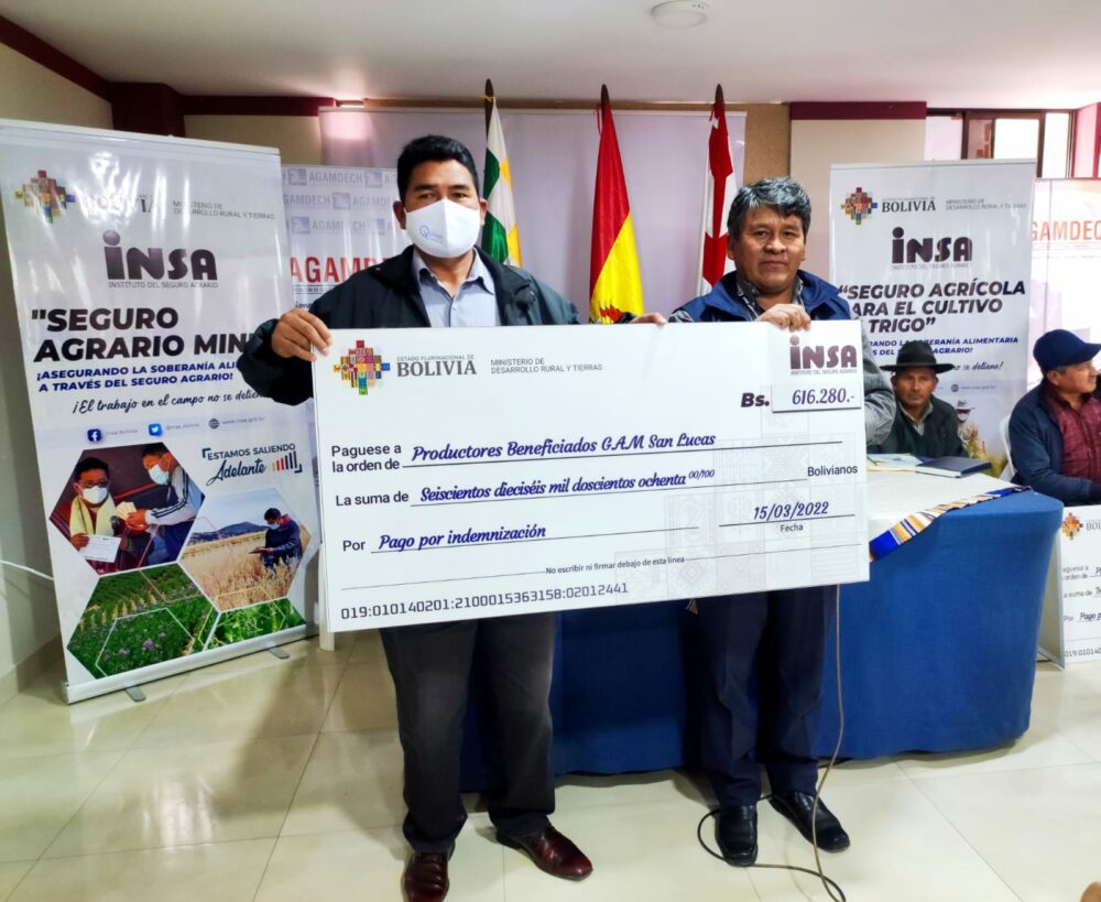 El Instituto del Seguro Agrario (INSA) entregó este miércoles cheques simbólicos a los municipios de San Lucas, Romina, Tarvita y Villa Charcas del departamento de Chuquisaca, cuyos cultivos fueron afectados por fenómenos climáticos en la campaña 2020 – 2021.