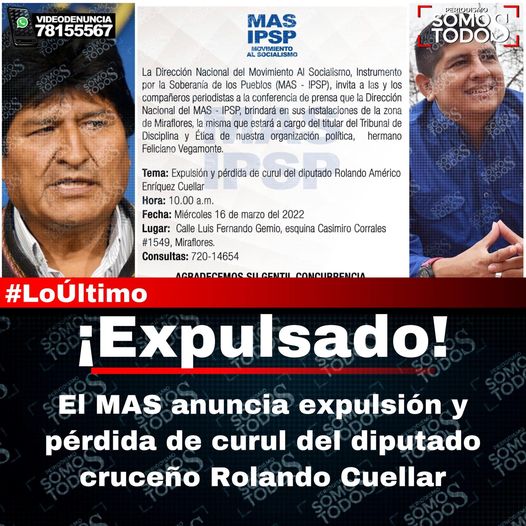 El Movimiento Al Socialismo (MAS) informará este miércoles sobre la expulsión y pérdida de curul del diputado por Santa Cruz Rolando Américo Enríquez Cuellar.