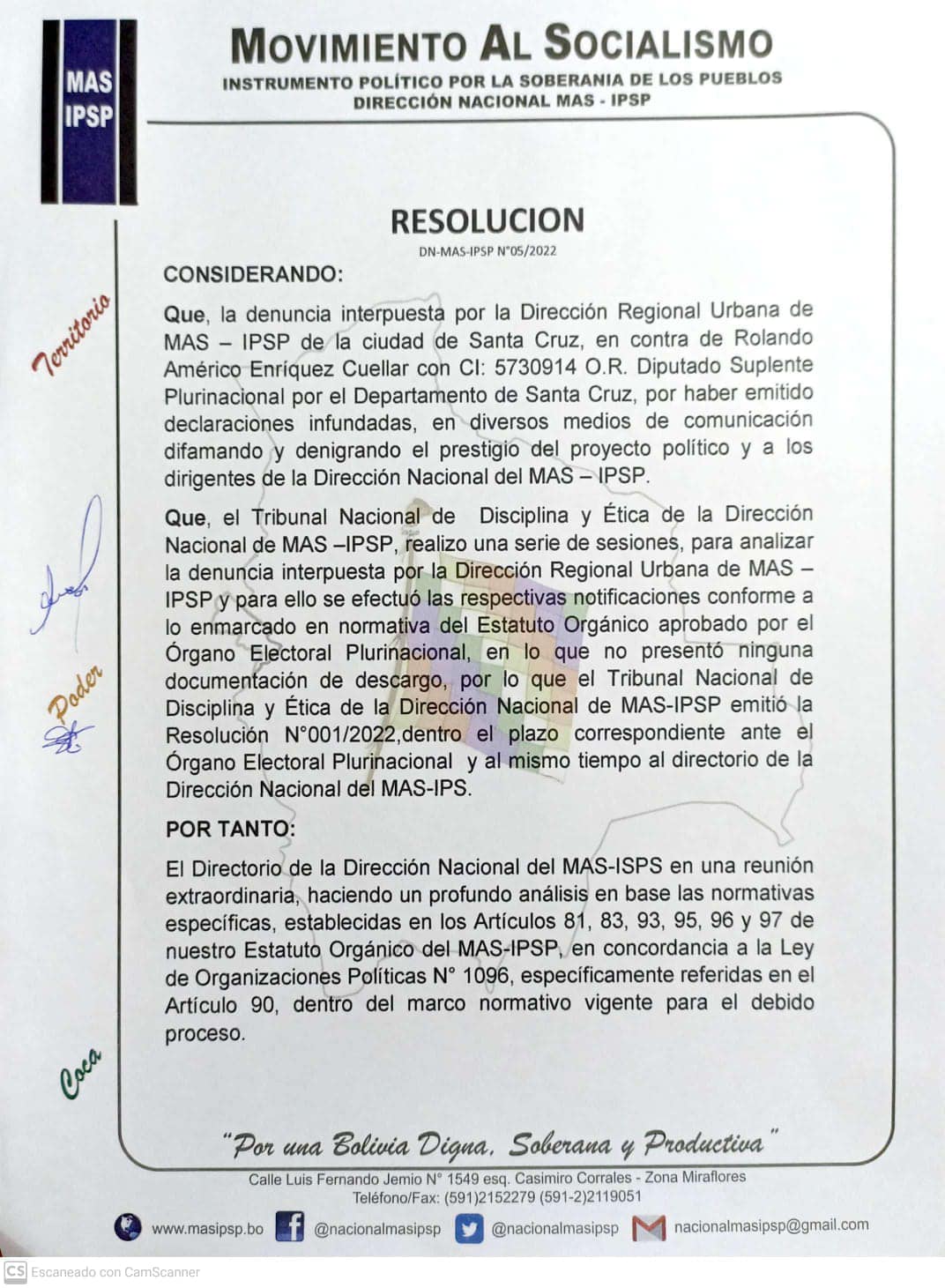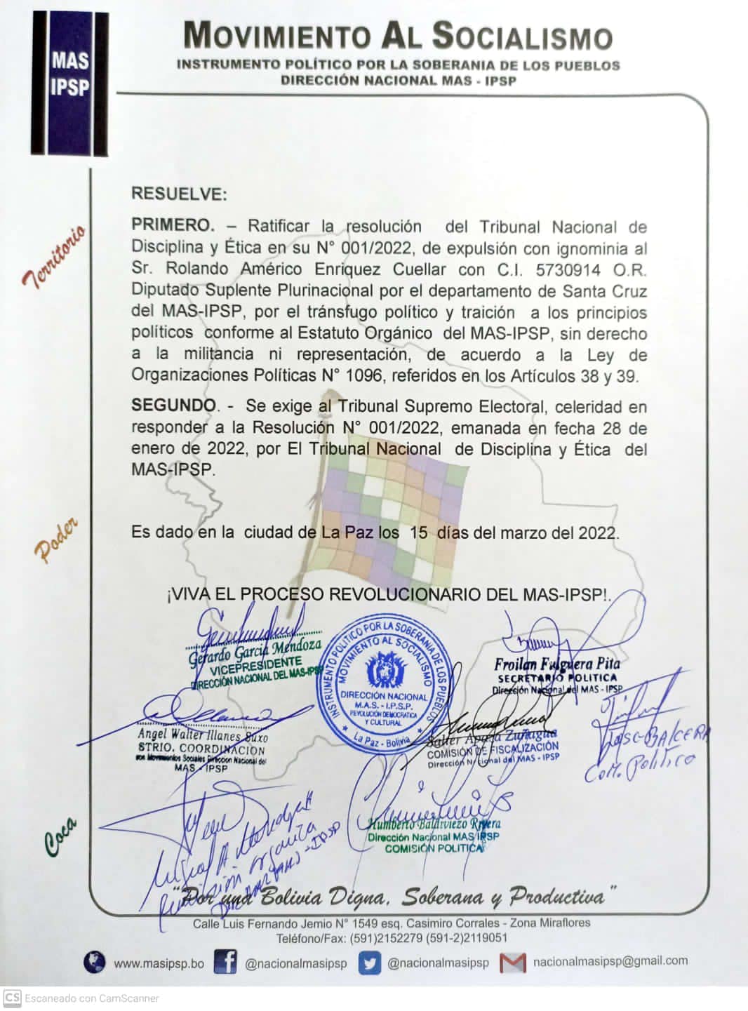 Lee la resolución 05/2022 en la que se hace oficial la expulsión del Movimiento Al Socialismo (MAS) del diputado suplente Rolando Enríquez Cuellar, por faltas graves como transfugio político con intención de dividir y erosionar desde dentro al movimiento popular.
