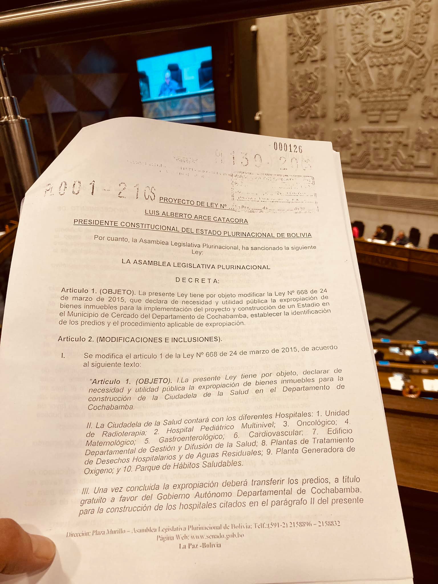 Asambleísta del MAS, Sergio de la Zerda, informa que el proyecto de una Ciudadela de la Salud para Cochabamba tiene vía libre gracias a la aprobación del proyecto de ley por parte de la Asamblea Legislativa Plurinacional.