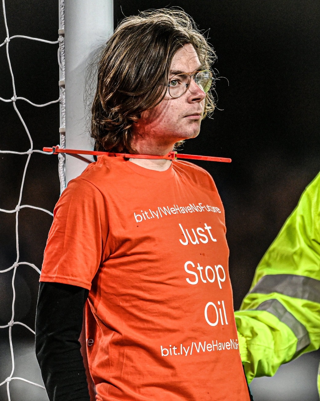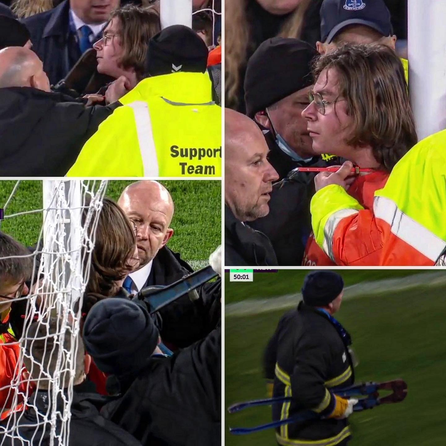 ¡Insólito! Durante el partido entre Everton y Newcastle en Goodison Park 🏴, un fanático se saltó al terreno de juego y ató su cuello al poste de una de las porterías. Esto, como modo de protesta.