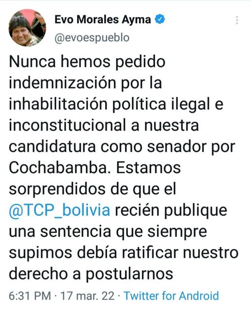 Evo:»Nunca hemos pedido indemnización por la inhabilitación política ilegal a nuestra candidatura como senador»