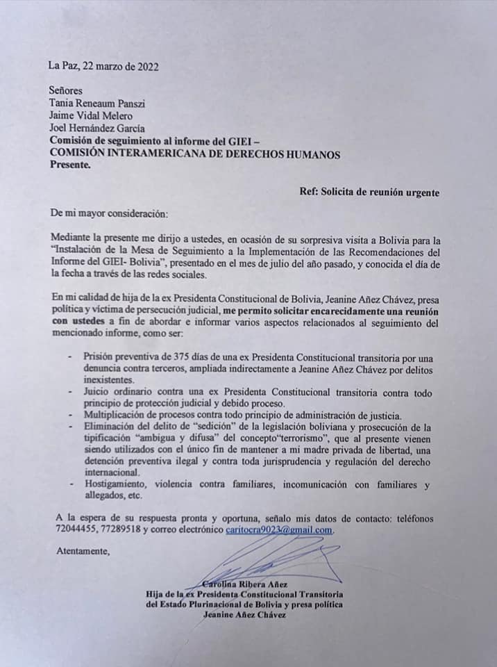 A través de su cuenta de Twitter, Jeanine Añez, pidió a la comisión de seguimiento del informe del GIEI que, con la diligencia con que se han reunido con el Ministerio de Justicia, presente en La Paz, que reciba a Carolina Ribera que solicitó una reunión urgente por los abusos en su contra.