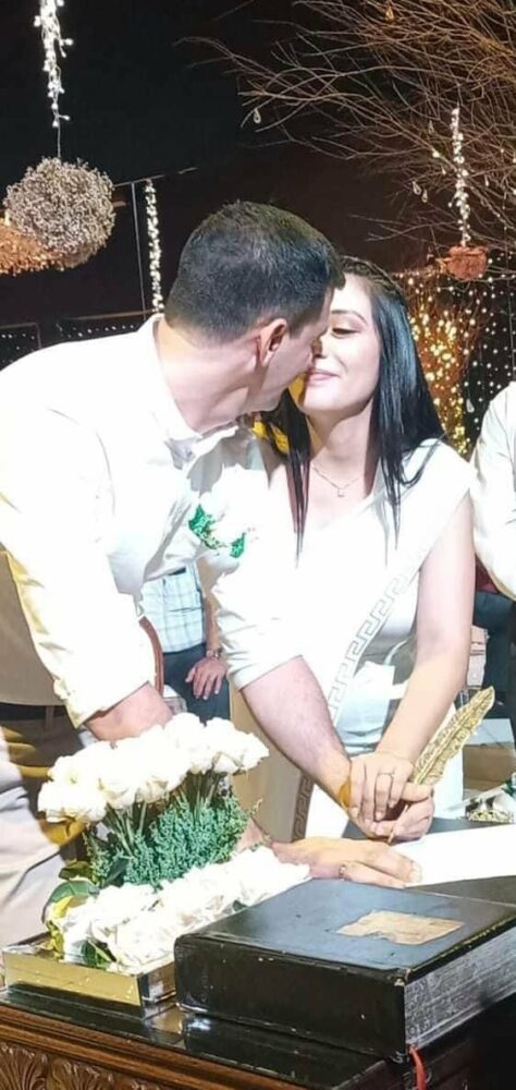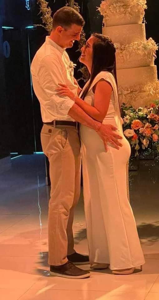 Boda sencilla, sin traje largo ni velo, de pantalona y con el novio solo de camisa.