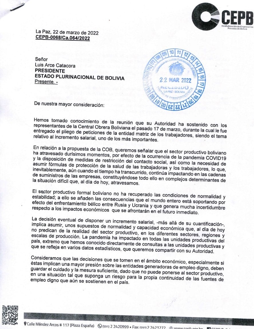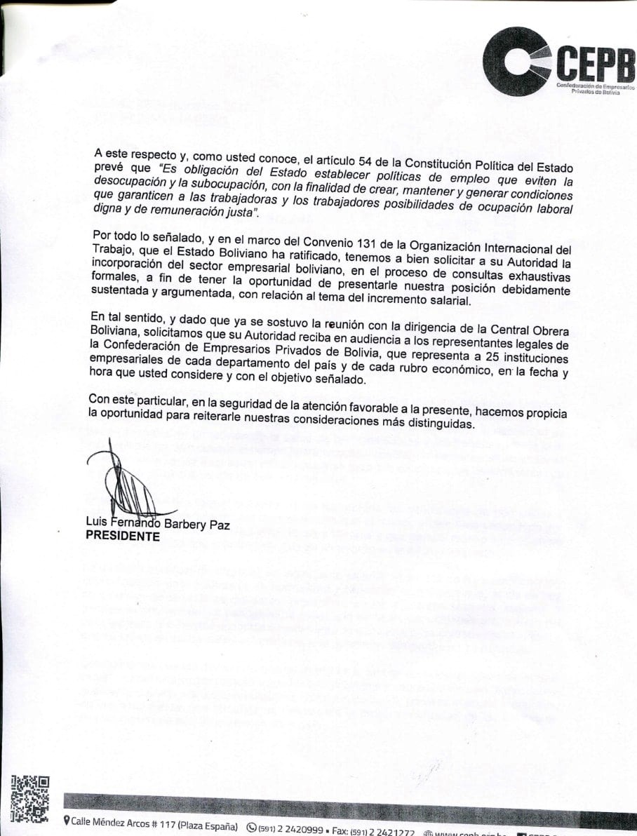 #CEPB piden reunión con Arce para tratar el aumento salarial