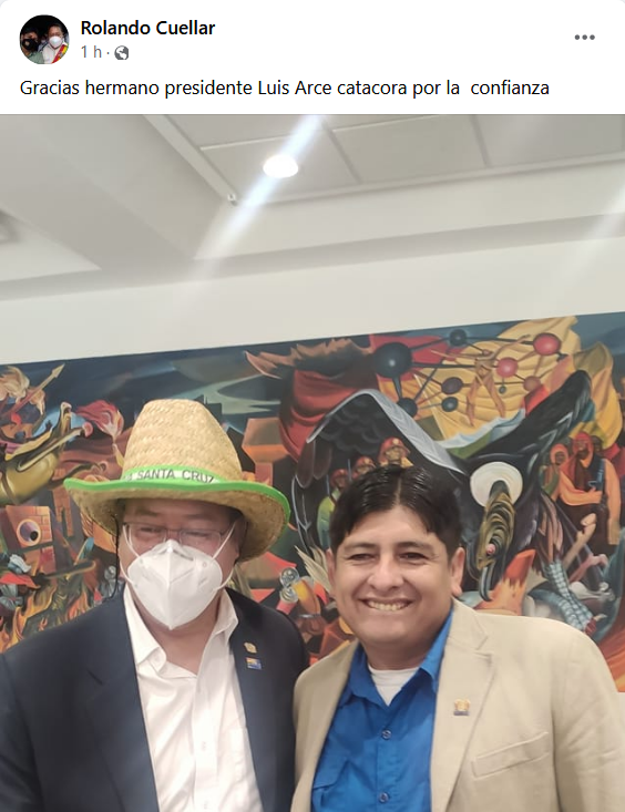 El diputado Rolando Cuellar se muestra muy sonriente al lado del presidente Luis Arce. «Gracias hermano presidente Luis Arce Catacora por la confianza», expresó.