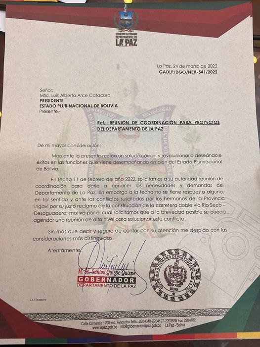 El gobernador de La Paz, Santos Quispe, solicitó al presidente Luis Arce una reunión de coordinación de proyectos y en busca de una solución al conflicto por la doble vía a Desaguadero.