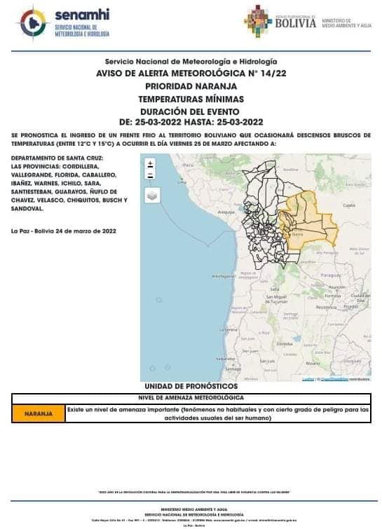 #ATENCIÓN: Senamhi Bolivia emite alerta, prioridad naranja, por ingreso de un frente frío al territorio boliviano que ocasionará descenso brusco de temperaturas, entre 12° y 15° centígrados para el departamento de #SantaCruz.