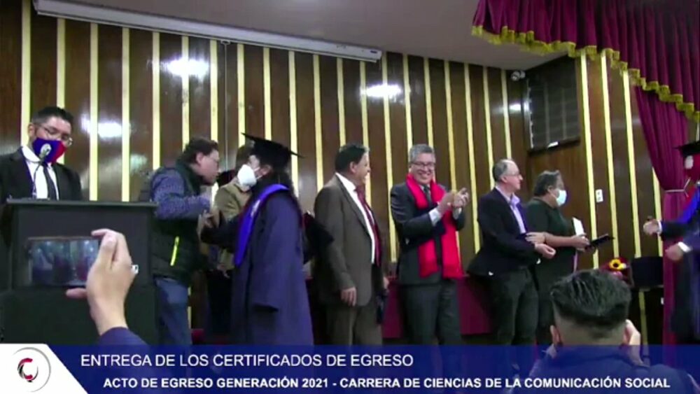 Vestido de Spider-Man, un estudiante de la Carrera de Comunicación de la UMSA recibió su diploma de egreso, en un acto que contó con la presencia del rector Óscar Heredia. Sucedió este viernes.