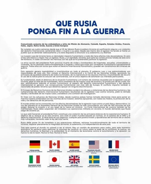 Embajadores de Alemania, Canadá, España, EEUU, Francia, Italia, Japón, Reino Unido, Suecia y UE en #Bolivia hacen conocer un comunicado conjunto a la sociedad y piden a #Rusia y su gobierno terminar con la guerra contra #Ucrania