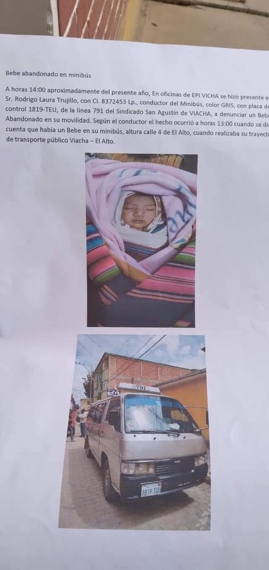 Una bebé fue abandonada al interior de un minibus de servicio público que presta su servicio de Viacha a El Alto. El chofer del vehículo se percato del menor cuando se encontraba en la calle 4 de la urbe alteña.