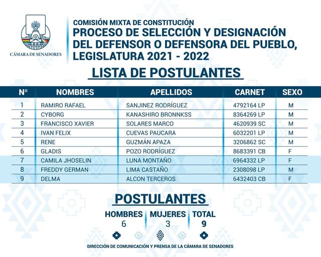 Este es el último reporte de los postulantes al Defensor o Defensora del pueblo, hoy se registraron tres nuevos postulantes. Hasta la fecha son nueve inscritos.