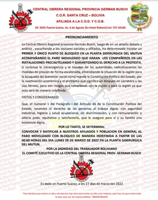 Trabajadores de la siderúrgica #Mutún entran en paro indefinido