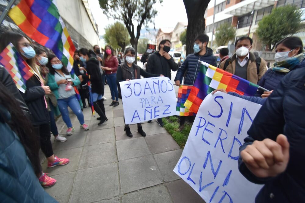 Afuera, decenas de personas con pancartas y carteles, con leyendas de “30 años para Añez”, aguardaban el inicio de alegatos orales. Algunos portaban fotografías de fallecidos en la zona de Senkata, en El Alto.