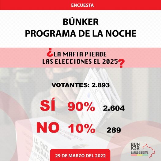 #EncuestaBunker ¿La mafia pierde las elecciones el 2025? 29 de marzo de 2019Categorías NoticiasEtiquetas , Agustín Zambrana en El Bunker, Facebook 29/03/2022 #EncuestaBunker ¿La mafia pierde las elecciones el 2025? 29 de marzo de 2019🇧🇴 Fuente: Agustín Zambrana en El Bunker