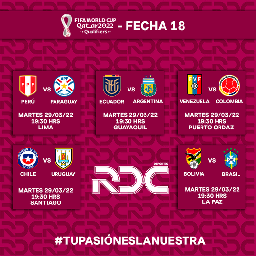 Agendá los horarios para la fecha 18 de las Eliminatorias CONMEBOL.com rumbo a Qatar 2022.