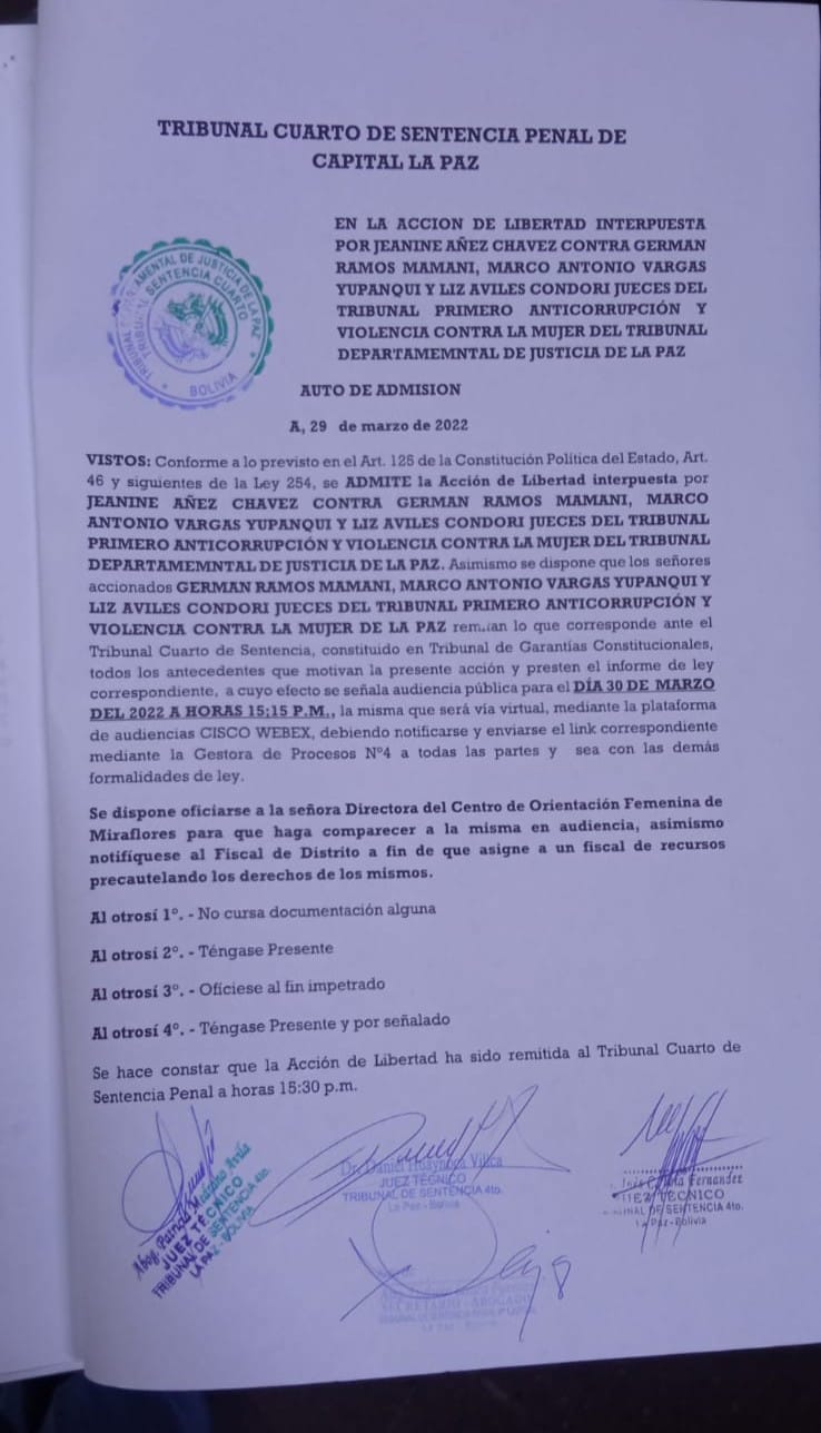 El Tribunal Cuarto de Sentencia en lo Penal fijó para las 15:15 la audiencia de Acción de Libertad, que interpuso la defensa de Jeanine Añez contra el tribunal que lleva adelante el juicio por el caso denominado «golpe de Estado II».