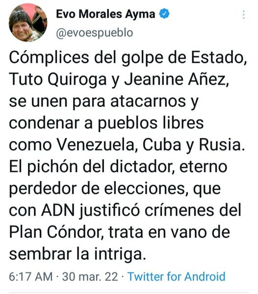 El expresidente Evo Morales, arremetió contra Tuto Quiroga a quien llamó «pichón del dictador y eterno perdedor de elecciones».