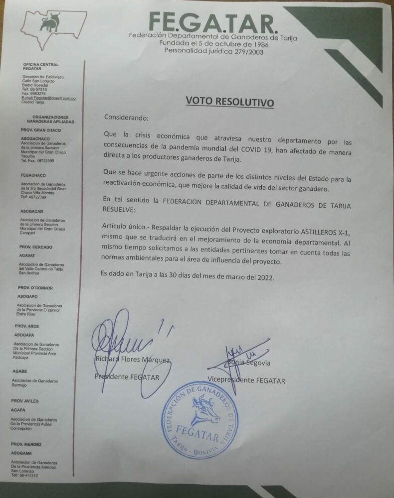 “En tal sentido la Federación Departamental de Ganaderos de Tarija, resuelve: Artículo único. Respaldar la ejecución del proyecto exploratorio Astillero X-1, mismo que se traducirá en el mejoramiento de la economía departamental. Al mismo tiempo solicitamos a las entidades pertinentes tomar en cuenta todas las normas ambientales para el área de influencia del proyecto”, se lee en el documento publicado por la entidad.