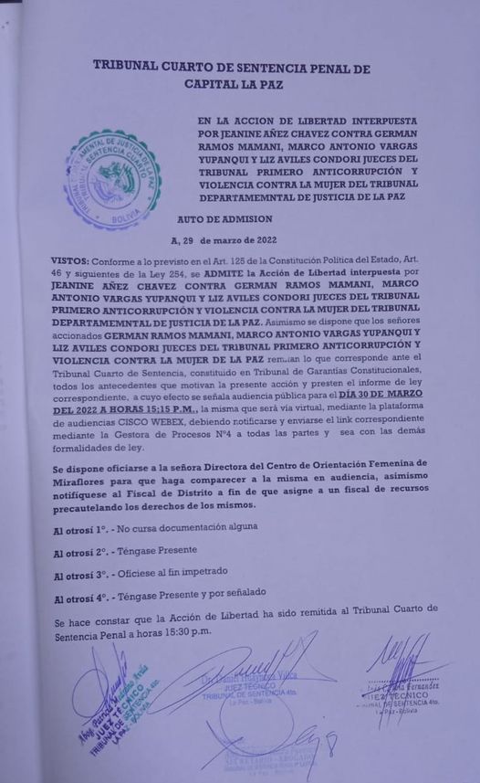Admiten acción de libertad interpuesta por la Jeanine Añez contra cinco jueces del Tribunal Primero Anticorrupción y Violencia contra la Mujer del Tribunal de La Paz.