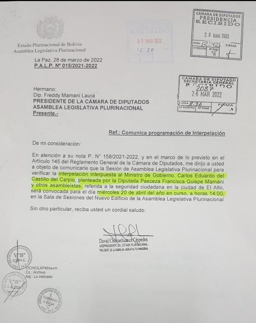 El presidente de la Asamblea Legislativa Plurinacional, David Choquehuanca, programó la interpelación al ministro de Gobierno, Eduardo del Castillo, para el 20 de abril a horas 14:00.