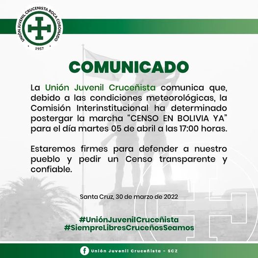 #RKC #RRSS /// El ingreso de un frente frío hace que los de la Unión Juvenil Cruceñista posterguen su marcha para el martes 5 de abril, dicen que la marcha es por un censo transparente….que opinan ?