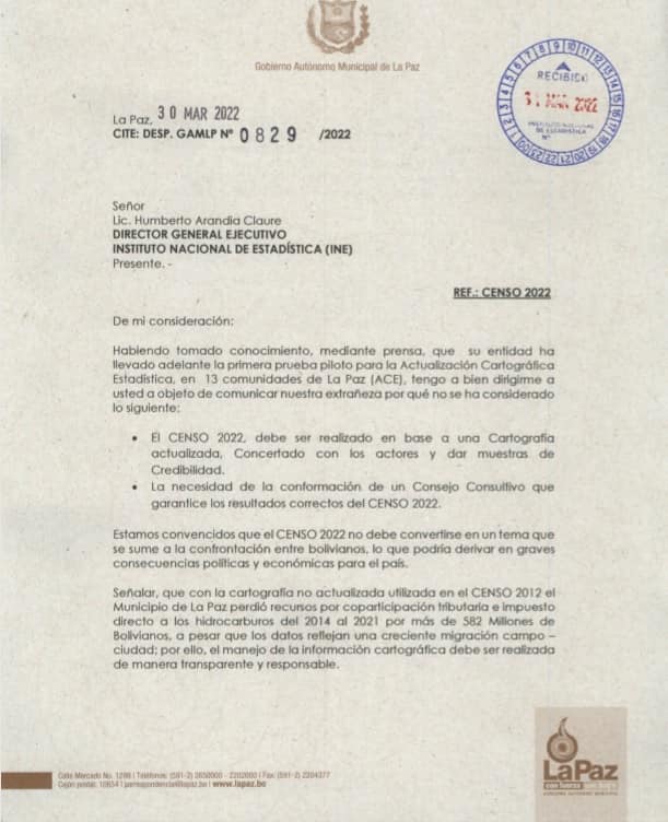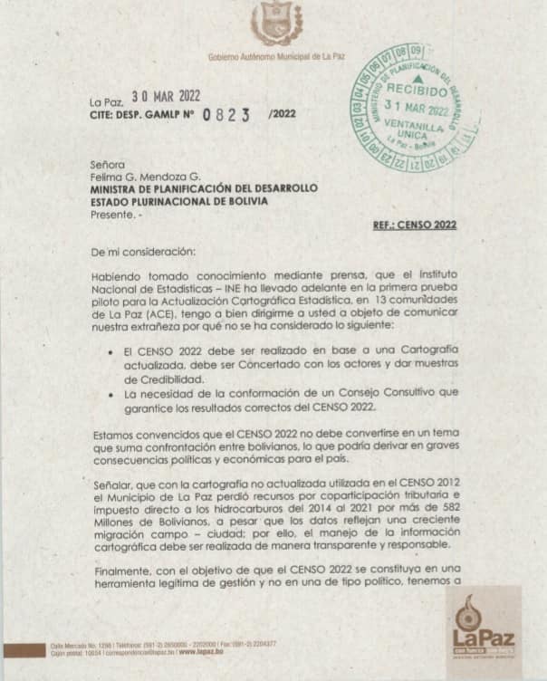 El alcalde de La Paz, Iván Arias, informó que envió cartas al Gobierno y al Instituto Nacional de Estadística expresando su voluntad para dialogar y participar del diseño técnico del Censo 2022 para que no se convierta en un tema de confrontación entre bolivianos sino en un pacto social y económico para el país. «Estoy atento para concertar», señaló.