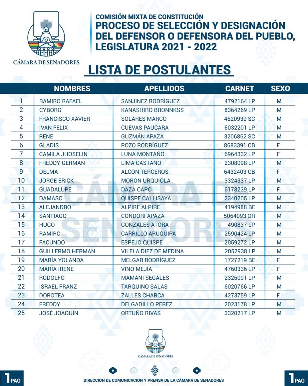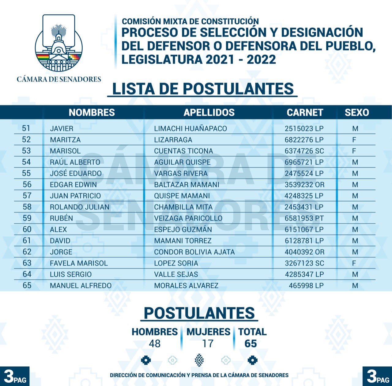 En el penúltimo día de inscripciones para los postulantes al Defensor del Pueblo, se registraron 33 nuevos postulantes. A la fecha son 65 inscritos, 17 mujeres y 48 hombres.