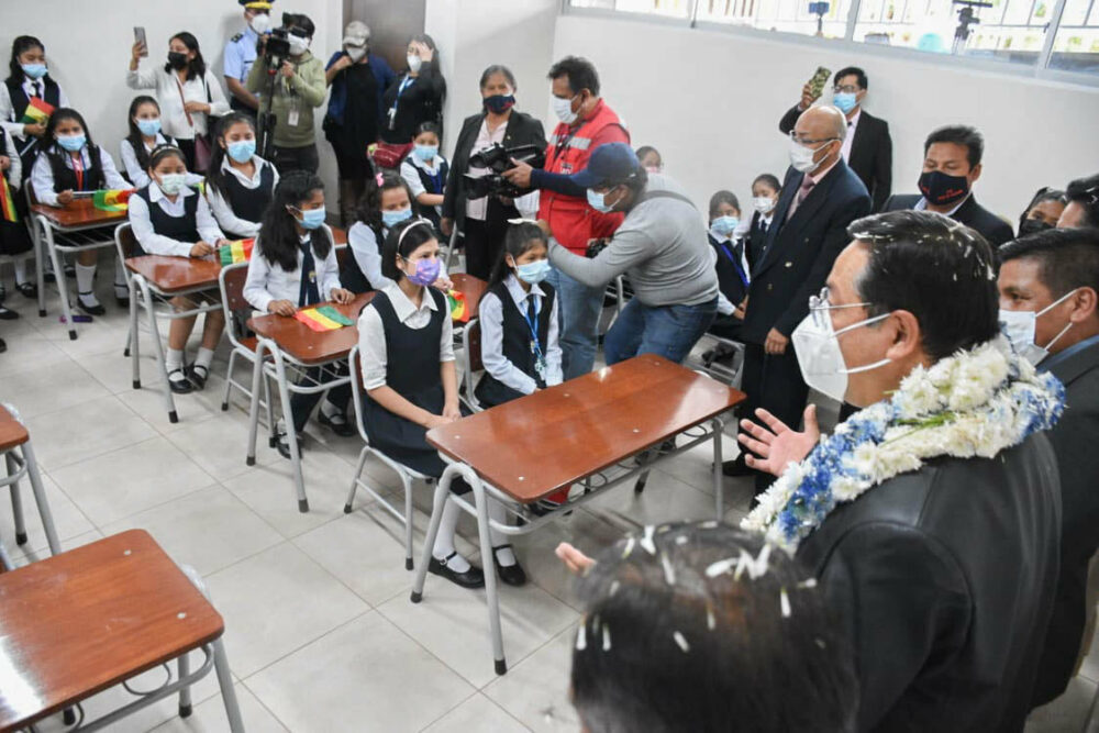 El presidente Luis Arce inauguró este jueves infraestructuras nuevas para tres unidades educativas de la ciudad de Cochabamba, para garantizar el retorno de los estudiantes a las clases presenciales. Esas obras demandaron una inversión de Bs 11,3 millones.