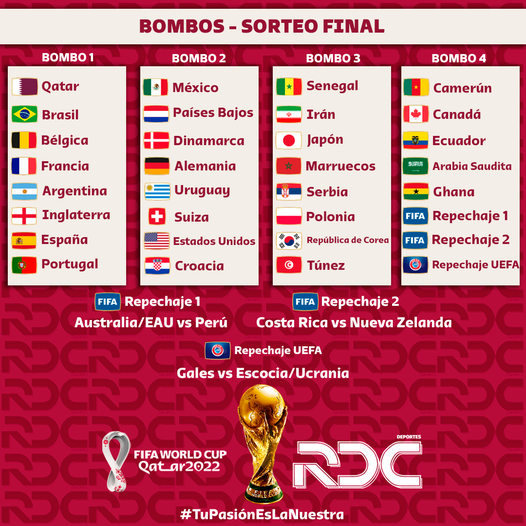 BOMBOS DEFINIDOS 🇶🇦⚽ Este Jueves se publico el ranking FIFA que servirá de referencia para la distribución de los bombos del Sorteo final de la FIFA World Cup, que tendrá lugar este viernes 1 de abril a las 12:00 Hrs (Hora Bolivia). #RDC #RedacciónDeportes
