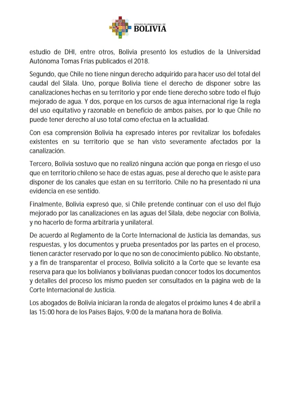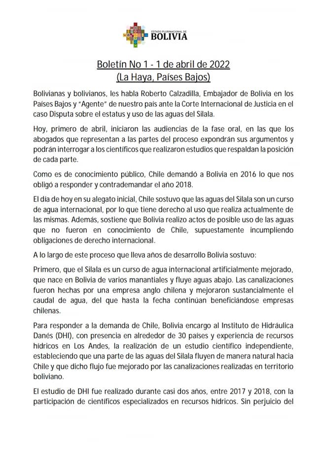 Bolivia solicitó que se levante la reserva de documentos y prueba presentados por las partes en el proceso, así lo informó el embajador de Bolivia en los Países Bajos y agente ante la Corte Internacional de Justicia en el caso sobre el estatus y uso de las aguas del Silala, Roberto Calzadilla.