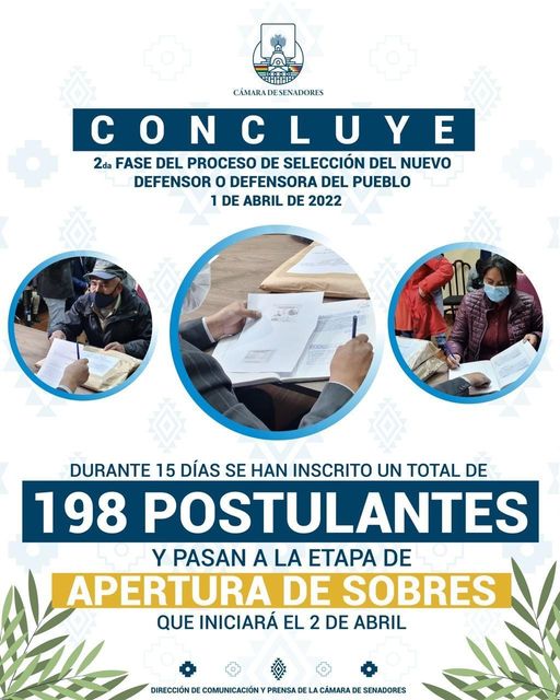 Tras haber concluido la recepción de postulaciones para el cargo de Defensor o Defensora del Pueblo con 198 inscritos en un lapso de 15 días, ahora se espera la apertura de sobres, que será el 2 de abril.