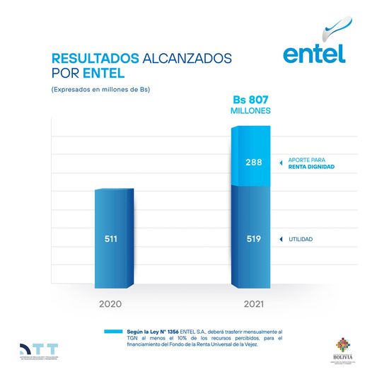 La Paz, 1 abril 2022.- La Empresa Nacional de Telecomunicaciones (ENTEL S.A.) logró en la gestión 2021 un rendimiento económico de Bs 807 millones, monto que supera en 58% al registrado en 2020, considerando condiciones equivalentes de comparación entre ambas gestiones.