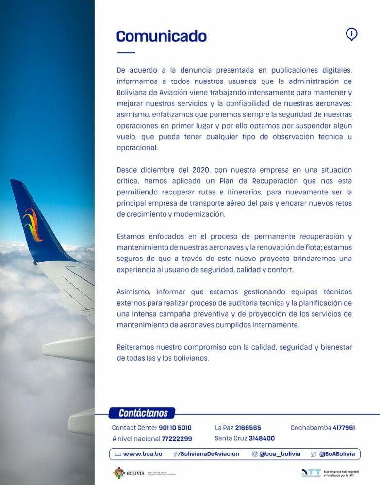 🔵 #ANF | Ante las últimas denuncias, la aerolínea estatal @BoABolivia comunica que «viene trabajando intensamente para mantener y mejorar» sus servicios y la confiabilidad en sus naves. Asimismo, asegura que gestiona equipos externos para un proceso de auditoría técnica. https://t.co/X8Rh7NE1P2